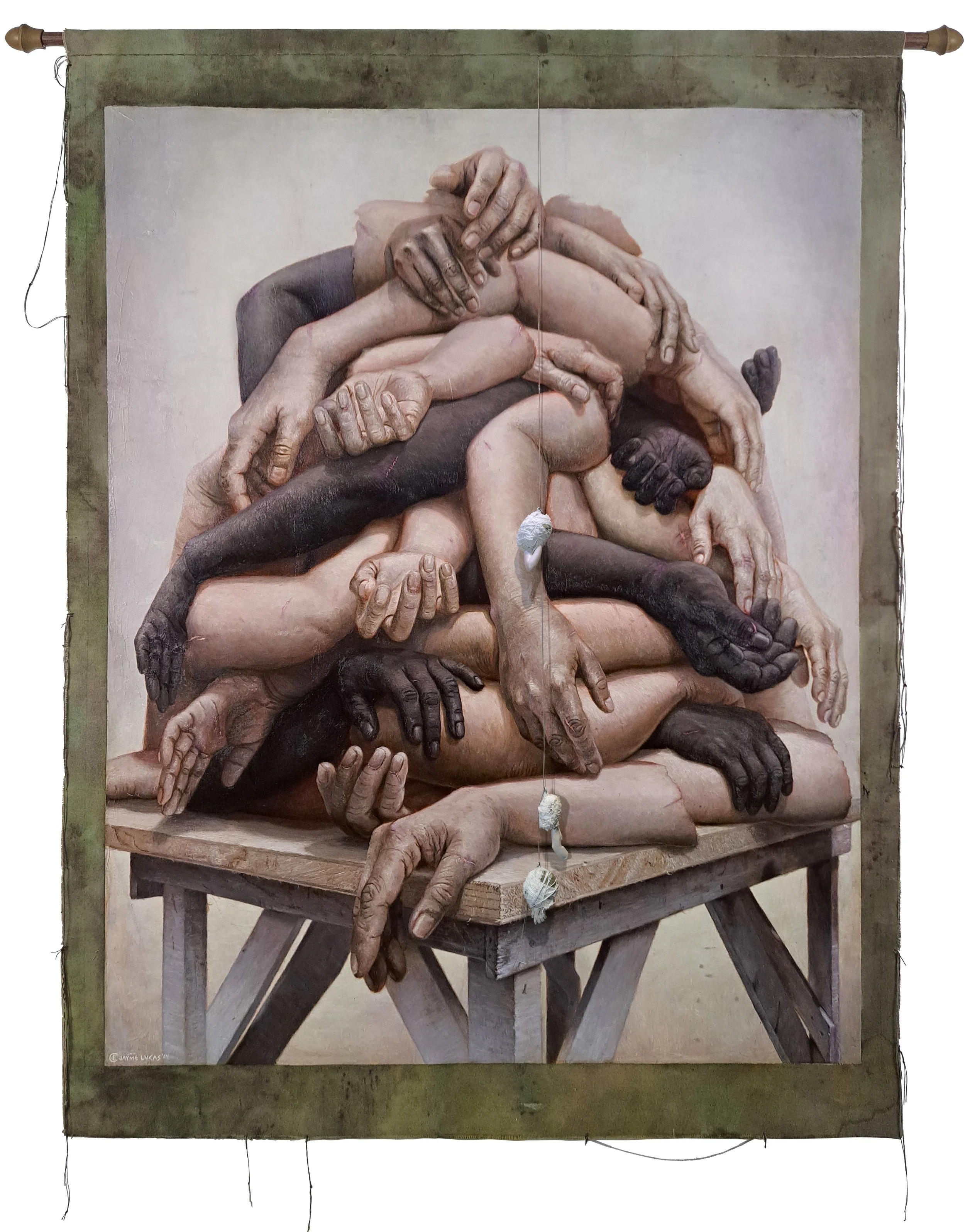 “Extra Limbs” Epoxy clay, fabric, thread, acrylic and oil on canvas 139.7 x 106.68 cm 2024